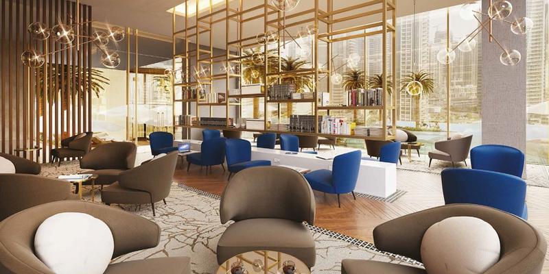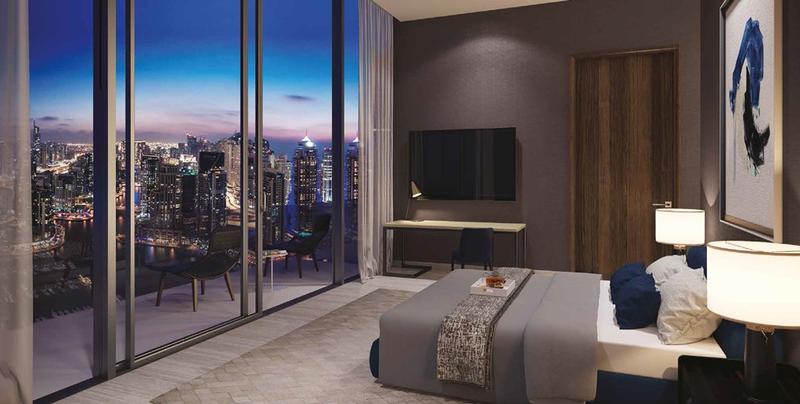 Jumeirah Living Marina Gate is a 56-storey building. On the first 8 floors there will be a duplex villa with 3-4-5 bedrooms. Further, from 9th to 18th floors, the hotel will occupy (104 rooms), floors from 19-55 - private residences, 56th floor - two penthouses.