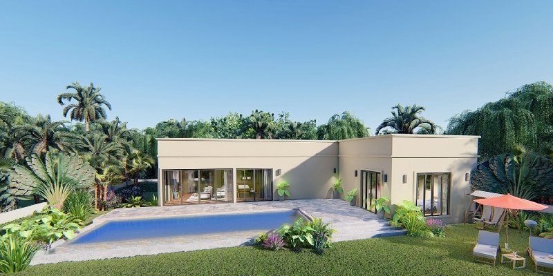 Various house plans are available, but there are modification options for specific needs. All houses will include a private pool and garage.