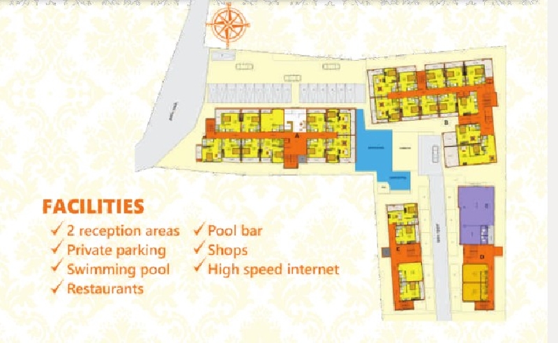 酒店的基礎設施包括游泳池,餐廳和酒吧 游泳池,停車場,商店和其他設施。 B樓的建築面積為31-44.5平方米。 m,單臥室公寓40-74.5平方米
