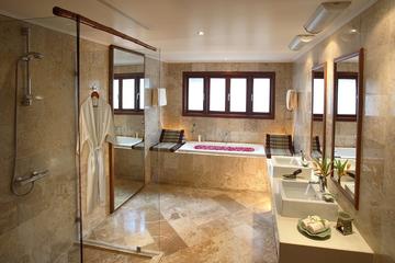 兩層別墅有4(+1)間臥室和5間浴室。一樓設有一個公共區域,設有三間臥室,一個小型游泳池和可直通花園的露台。兩間臥室設有更衣室,浴缸和淋浴。酒店還設有帶電影院和台球室的娛樂區,帶自動門的車庫,技術室和多個存儲設施。 二樓有三個側翼:左翼設有主臥室,更衣室,帶按摩浴缸的浴室,獨立淋浴間和私人陽台;右翼設有休息區,可作為第五間臥室,接待區和客用浴室;後翼設有大廚房,酒吧,餐廳和夏季廚房。最後,二樓設有帶頂棚的露台,幾個開放式露台和一個游泳池。